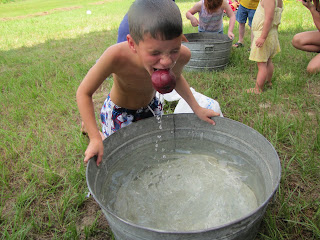 Saturday is the "Big day." Lunch, horseshoes, washers, volleyball, apple bobbin', swing sets, a slip n'slide & supper keeps everyone entertained. Whew weee...it was Hot! I'm sure family reunions were way more exciting back in the day...before the wonderful world of facebook. Now, everyone knows what you are doing, so there really isn't that much "new stuff" to share. One of my conversations went like this..."I'm so glad you were able to come. I was worried that you weren't able to get off work. Yeah, I keep up with you on facebook!!" haha...their response..."Kayla, your new office is beautiful! How are Lola & Chico? Now, tell me again when Donny goes back to the doctor." I couldn't help but giggle...